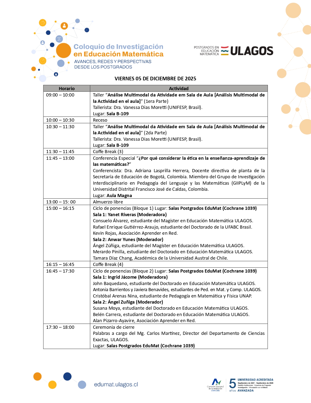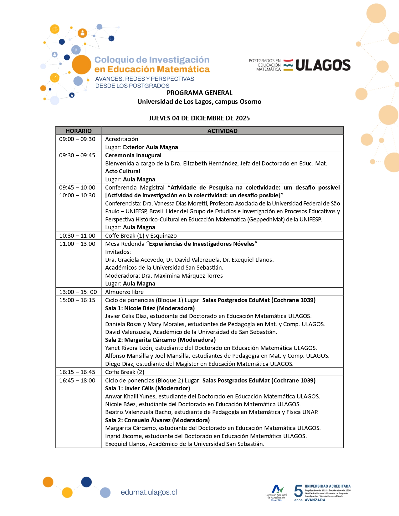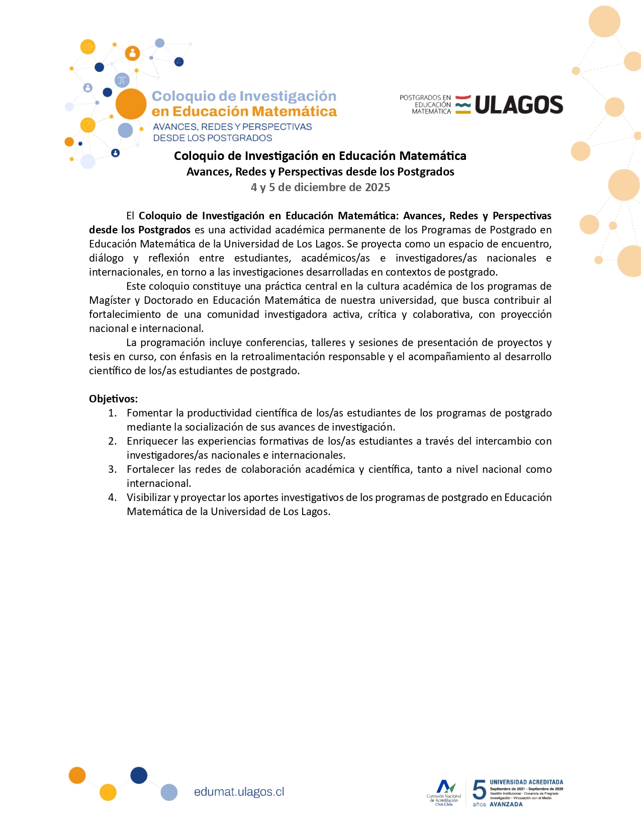 El Comité Académico Organizador de los Postgrados en Educación Matemática de la Universidad de Los Lagos invita cordialmente a estudiantes, académicos/as e investigadores/as a participar en el Coloquio de Investigación en Educación Matemática: Avances, Redes y Perspectivas, a realizarse los días 4 y 5 de diciembre de 2025.