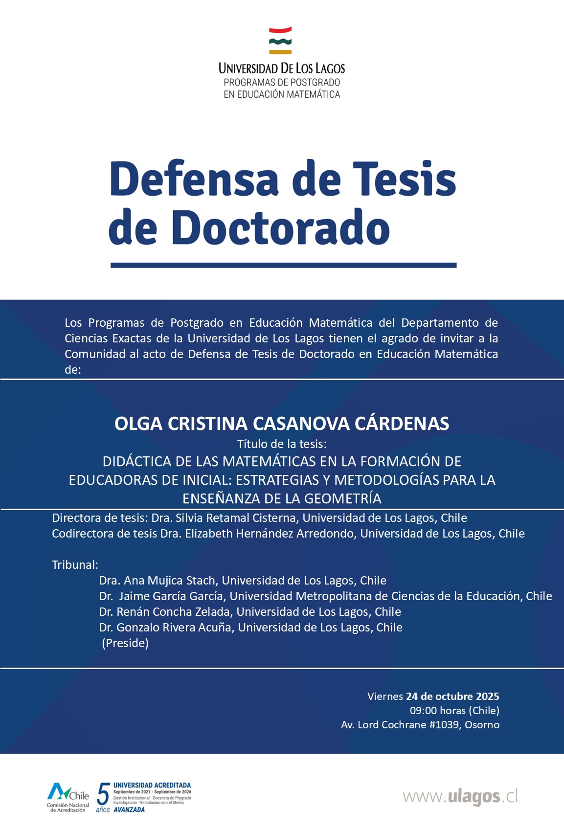 Defensa examen de Grado Olga Cristina Casanova Cárdenas| Viernes 24 de octubre de 2025|09:00 am (Chile)| Lugar presencial: Sala 1 Edificio de Formación Continua-Lord Cochrane 1039