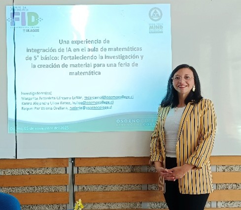Por otra parte, Margarita Cárcamo, también estudiante del Doctorado en Educación Matemática, expuso la investigación “Una experiencia de integración de IA en el aula de matemáticas de 5° básico: fortaleciendo la investigación y la creación de material para una feria de matemática”.